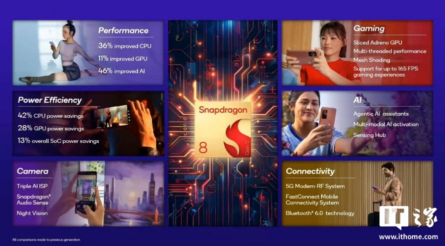 骁龙 8 Gen 5 还搭载了高通的 Hexagon NPU,与骁龙 8 Gen 3 相比,在 AI 任务上提升了 46%,支持设备端 AI 和多模态输入。此外,骁龙 8 Gen 5 带来了高通的 Spectra ISP 和 X80 5G 调制解调器-RF 系统 —— 这是去年在骁龙 8 Elite 上使用的调制解调器。