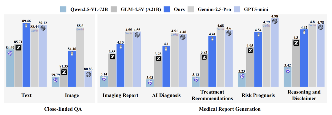 性能差距明显: 即使是参数量达 72B 的 Qwen2.5-VL-72B,平均性能也仅为 79.88%。领先的开源模型 GLM-4.5V (83.26%) 与顶尖专有模型 Gemini-2.5-Pro (89.23%) 之间仍存在近 6 个百分点的差距。在医疗报告生成任务中,更是差距明显,Qwen2.5VL-72B 和 Gemini-2.5-pro 差 30%。